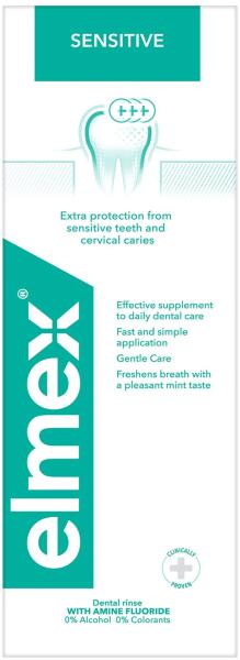 Elmex Sensitive szájvíz érzékeny fogakra, 400 ml ÖsszetevőkAquaPropylene glycolPEG-40 hydrogenated castor oilAromaOlaflurGlycerinSodium benzoateLevulinic acidSodium levulinatePVPHydroxyethylcelluloseSaccha rinSodium fluorideSodium anisateTartalmaz: nátrium-fluoridot, olaflurt (aminfluoridot) JellemzőkExtra védelmet biztosít a fogak túlérzékenysége ellenNem tartalmaz etilalkoholtAminfluoriddal a fogszuvasodás elleni hatékony védelemértSzínezékmentesGyors és egyszerű kiegészítése a napi fogmosásnak Termék információkAz elmex Sensitive szájvíz aminfluoriddal a napi szájápolás hatékony kiegészítője. Klinikai kutatások igazolták, hogy az elmex Sensitive szájvíz használata a fogmosás kiegészítéseként háromszor hatékonyabban véd a fognyaki szuvasodás ellen, mintha csak fogkrémet használna. Alkohol- és színezékmentes. Miért válnak érzékennyé a fogak?Ha az íny visszahúzódik, a normál körülmények között védett fognyak szabaddá és sérülékennyé válik, ilyenkor a hideg, meleg, savanyú és mechanikai ingerek fájdalmat okozhatnak. Az elmex® Sensitive szájvíz extra védelmet biztosít a fogak túlérzékenysége ellen. - Gyors és egyszerű kiegészítése a napi fogmosásnak: Az elmex® Sensitive szájvíz 30 másodperc alatt eljut a szájüreg minden részére. - Az aminfluorid védőréteget képez a fogak túlérzékenysége ellen, valamint a fognyaki szuvasodás elkerülése érdekében. Hogyan fokozzák az elmex szájvizek a fogmosás hatékonyságát?Több aktív összetevőt juttatnak a szájüregbe, amelyek könnyebben eljutnak a nehezen elérhető helyekre, így használat után több hatóanyag marad a szájban. További leírásAz elmex® Sensitive szájvíz aminfluoriddal a napi szájápolás hatékony kiegészítője. Klinikai kutatások igazolták, hogy az elmex® Sensitive szájvíz használata a fogmosás kiegészítéseként háromszor hatékonyabban véd a fognyaki szuvasodás ellen, mintha csak fogkrémet használna. Alkohol- és színezékmentes. Miért válnak érzékennyé a fogak?Ha az íny visszahúzódik, a normál körülmények között védett fognyak szabaddá és sérülékennyé válik, ilyenkor a hideg, meleg, savanyú és mechanikai ingerek fájdalmat okozhatnak. Az elmex® Sensitive szájvíz extra védelmet biztosít a fogak túlérzékenysége ellen. - Gyors és egyszerű kiegészítése a napi fogmosásnak: Az elmex® Sensitive szájvíz 30 másodperc alatt eljut a szájüreg minden részére. - Az aminfluorid védőréteget képez a fogak túlérzékenysége ellen, valamint a fognyaki szuvasodás elkerülése érdekében. Hogyan fokozzák az elmex szájvizek a fogmosás hatékonyságát?Töb
